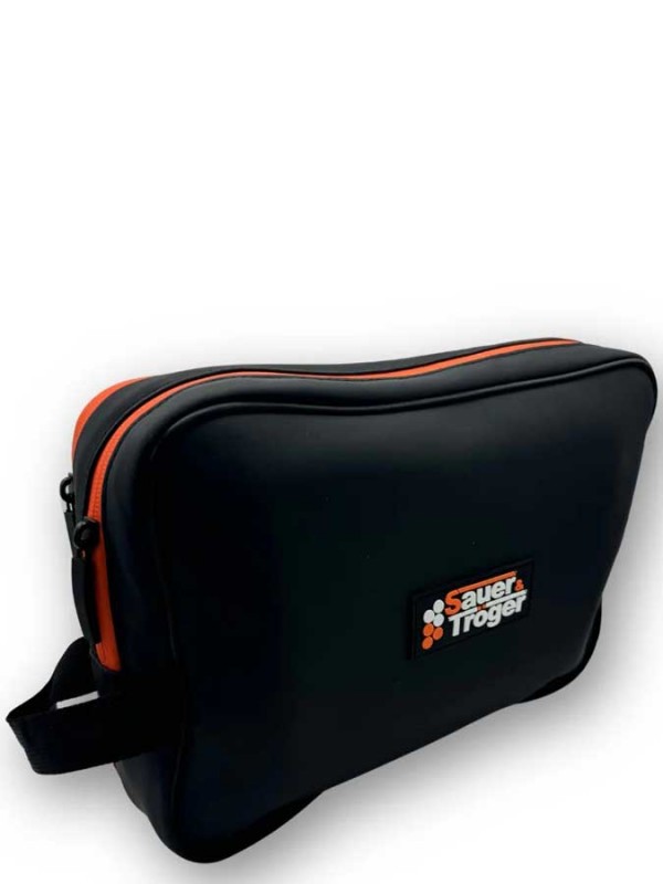 Dizajn v elegantni črni barvi z oranžnimi detajli in silikonskim logotipom Sauer & Tröger doda torbici moderen videz. Vodoodporna zadrga zagotavlja dolgotrajno uporabo.