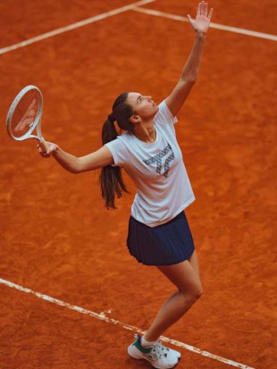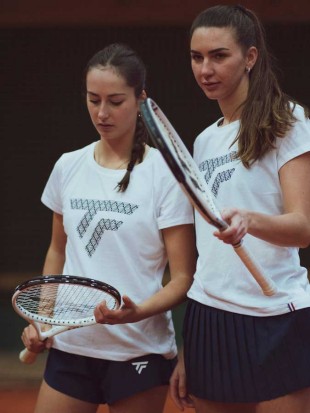 Bela majica ima spredaj logotip v kontrastni temno modri barvi , ter manjši napis Tecnifibre na hrbtnem delu. Majica je telirana, da se lepo prilega ženskemu telesu.