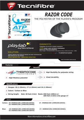 Tecnifibre je izdelal povsem novo struno Razor code. Ob sodelovanju z ATP-jem in pogovoru z igralci so ugotovili, da tekmovalci želijo struno klasične oblike, ki nudi dober spin potencial in zelo dobro obstojnost.