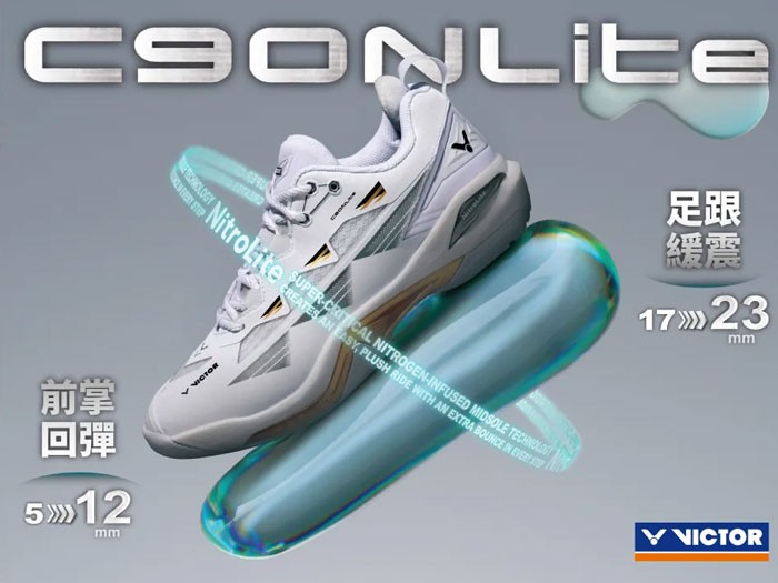 VICTOR C90NLite predstavlja novo generacijo badminton copat z izjemno močnim blaženjem udarcev. S kar 12 mm pene v sprednjem delu in 23 mm v peti nudi vrhunsko zaščito kolen in gležnjev, mehkejše pristanke ter visoko odzivnost. NitroLite pena, podaljšan LS-S stabilizator in napreden podplat zagotavljajo izjemno udobje, bočno stabilnost in hiter prenos teže. Na voljo v beli ter vijolično-črni kombinaciji.